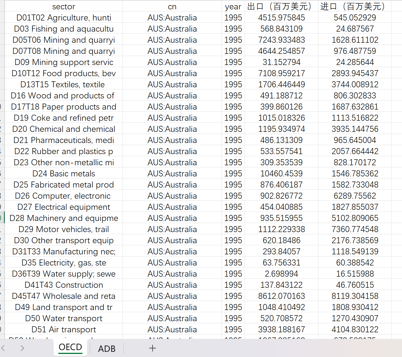 Sponge13 发表于 2023-8-21 11:22 世界各国进出口数据(进口额&出口额)数据来源为OECD数据库,ADB数据库 数据包括: