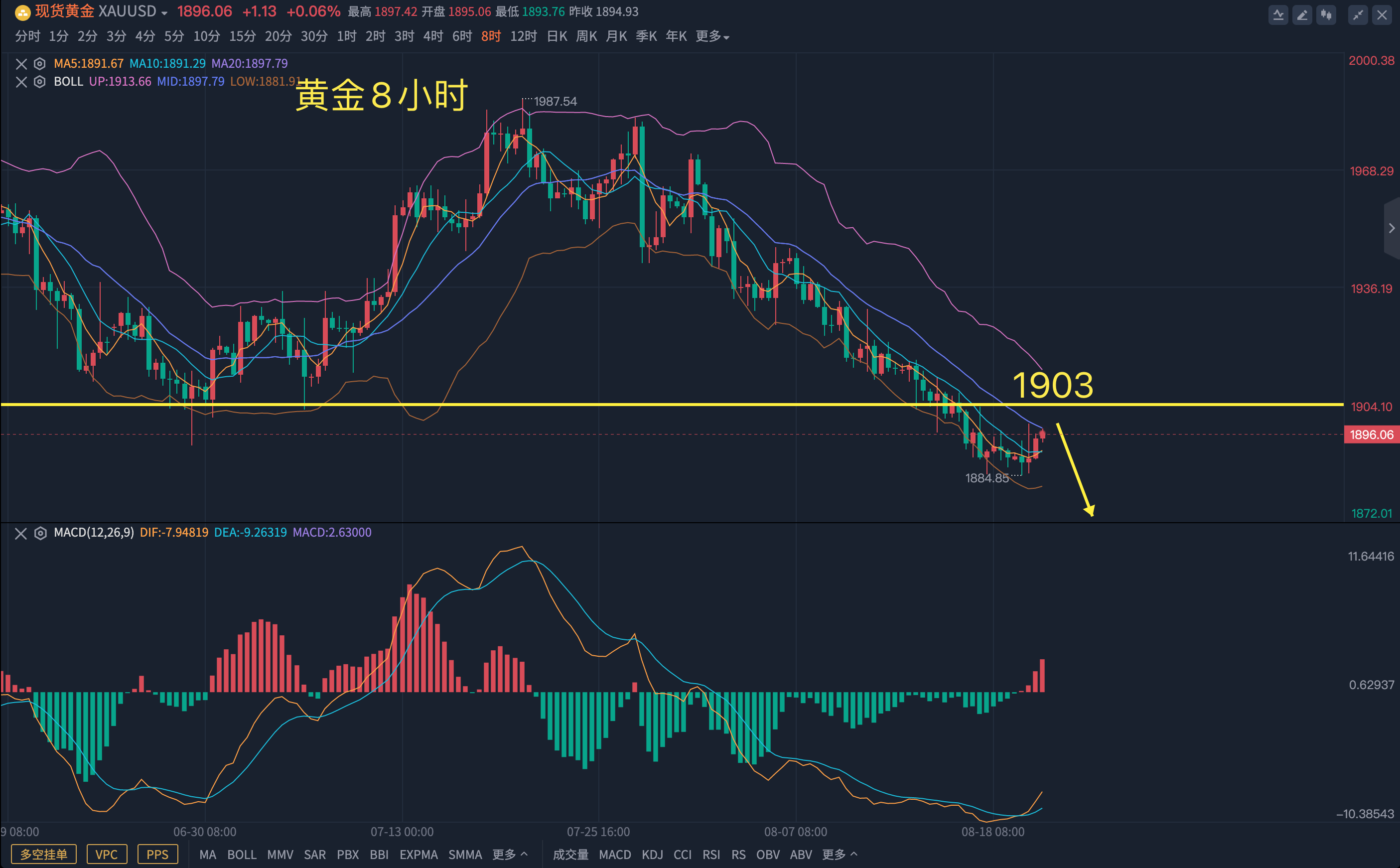 黄金策略:金价靠近1898-1900的区域继续空,损还是在1910的点,目标区域1882-1875,最低以10-15美金为离场标准,盈亏比比成功率更重要!