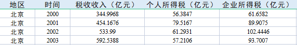 指标包含:地区 、时间、 税收收入(亿元)、 个人所得税(亿元)、 企业所得税(亿元)。