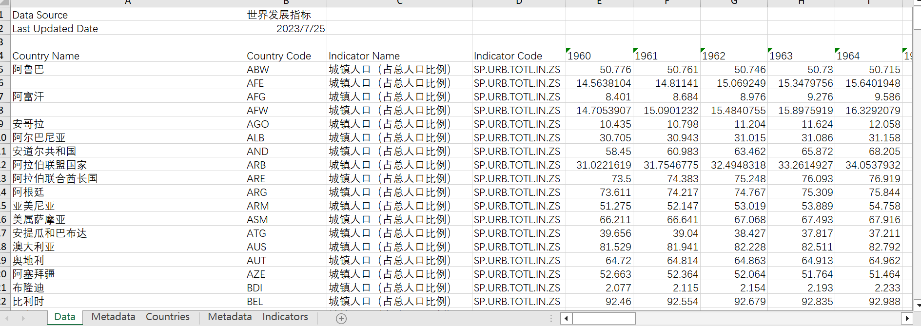 世界各国城镇人口占总人口比例1960-2022~给大家使用