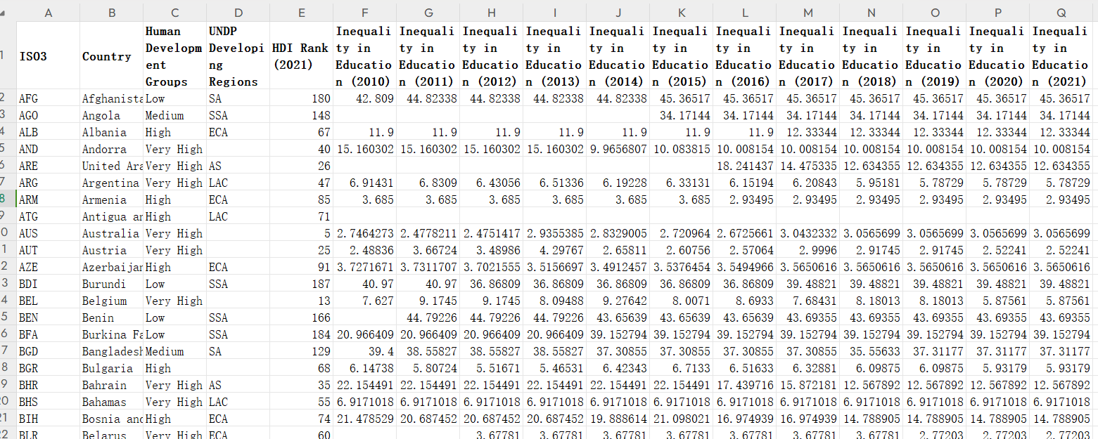 该数据集包含的历史数据涵盖了全球范围内与教育不平等相关的一系列指标。数据集的主要组成部分包括:ISO3、国家、人类发展集团、开发署发展中区域、人类发展指数排名(2021年)以及2010年至2021年的教育不平等。