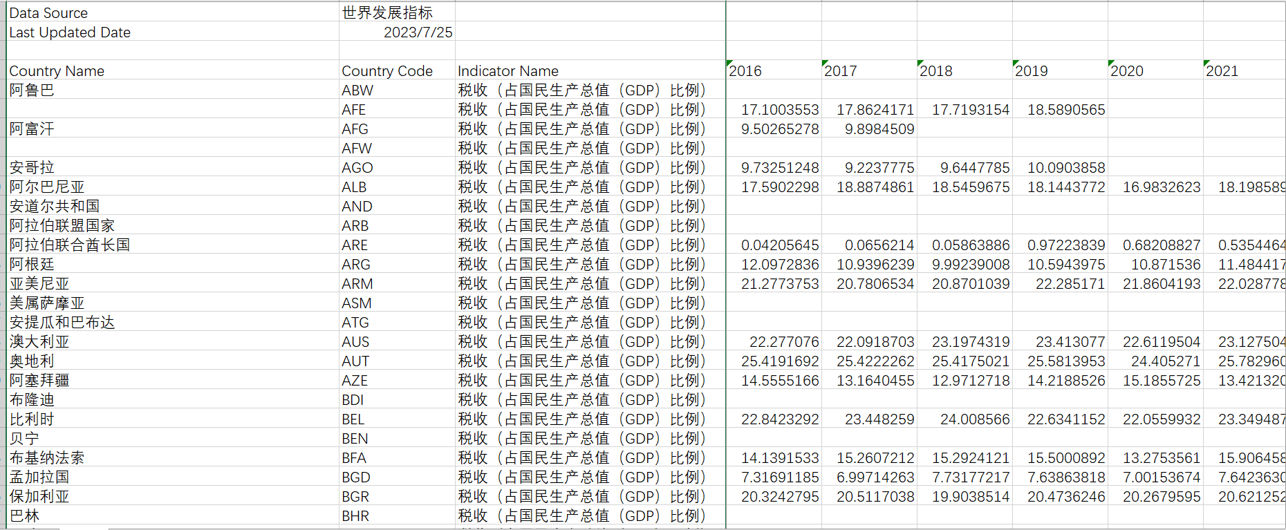 世界各国税收(占国民生产总值(GDP)比例)数据1980-2021 免费提供给大家~