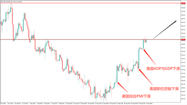影响美债利率的因素有很多,其中一个关键便是美国的就业数据。就在上周五,美联储主席鲍威尔曾在央行年会中说过,央行对降息心生犹豫的最大原因正是过热的就业市场。本周数据的下滑,无疑让投资者吃下了一颗定心丸。以美国职位空缺为例,一路从1100万降至880万,说明企业正在招聘的职位数据持续下滑,体现就业市场需求的走弱。既然需求已经受到限制,又何必继续加息?这种乐观的情绪让包括黄金和美股在内的全球多数资产集体转涨。