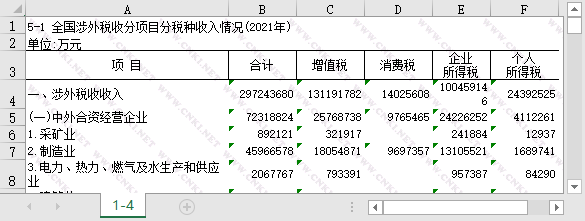 中国涉外税收分项目分税种收入2004-2021采矿制造电力热力燃气及水生产和供应业交通运输仓储邮政业等等