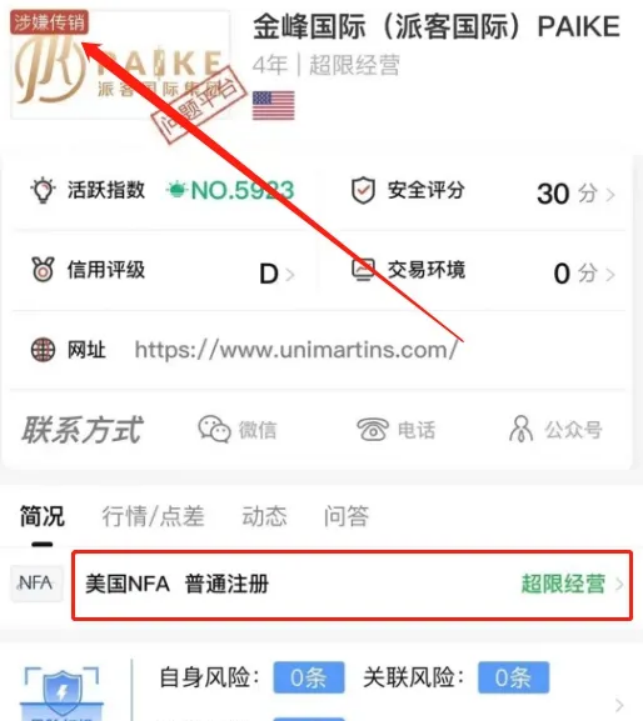 通过外汇天眼也可以看到不论是金峰国际还是派客国际,都被标注为了问题平台,涉嫌传销。可能之前确实有牌照,但是这个早都过期了属于超限经营了。从法律上来讲已经是违规的平台。