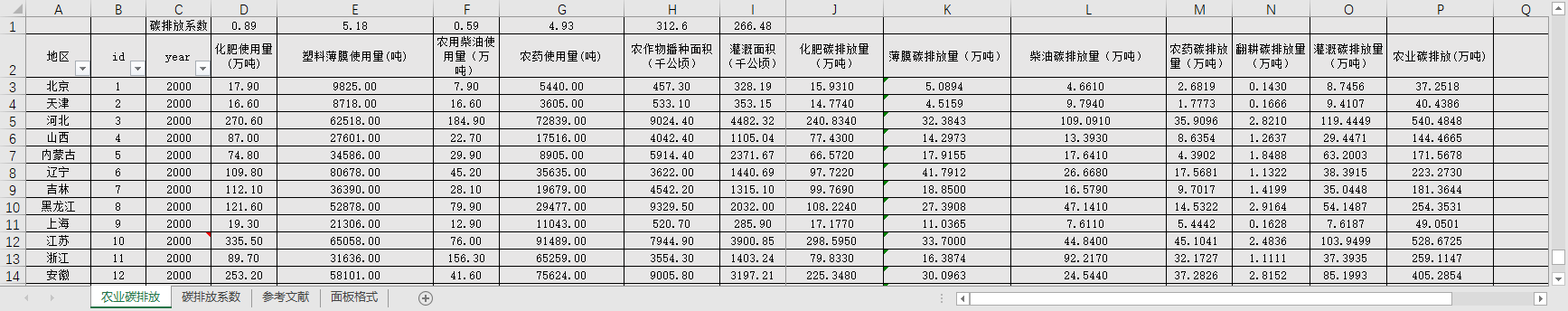主要指标:地区 id year 化肥使用量(万吨) 塑料薄膜使用量(吨) 农用柴油使用量(万吨) 农药使用量(吨) 农作物播种面积(千公顷) 灌溉面积(千公顷) 化肥碳排放量(万吨) 薄膜碳排放量(万吨) 柴油碳排放量(万吨) 农药碳排放量(万吨) 翻耕碳排放量(万吨) 灌溉碳排放量(万吨) 农业碳排放(万吨)