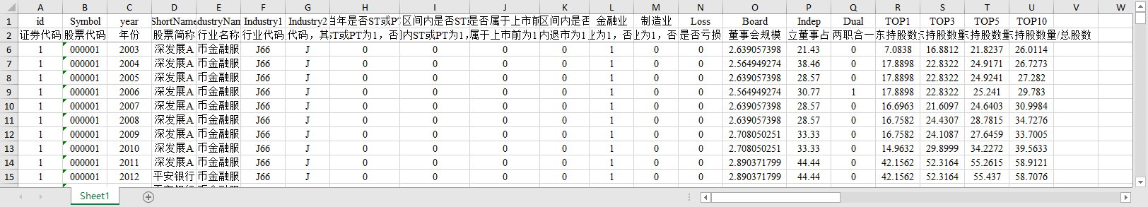 证券代码 股票代码 年份 股票简称 行业名称 行业代码 制造业取两位代码,其他行业用大类 当年ST或PT为1,否则为0 样本区间内ST或PT为1,否则为0 该观测值属于上市前为1,否则为0 样本区间内退市为1,否则为0 金融业为1,否则为0 制造业为1,否则为0 是否亏损 董事会规模 独立董事占比 两职合一 第一大股东持股数量/总股数 前三股东持股数量/总股数 前五股东持股数量/总股数 前十股东持股数量/总股