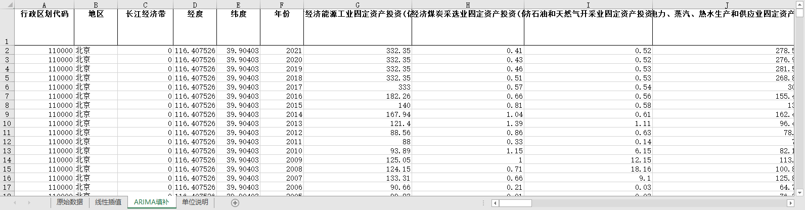 含原始数据、线性插值、ARIMA填补三个页签,其中ARIMA填补无缺失值。