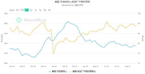 由图可见,美国的炼油厂利用率已经触及历史最高点,产能接近饱和;然而汽油的库存却在不断下降,这说明美国的石油市场已经出现了供不应求的现象。