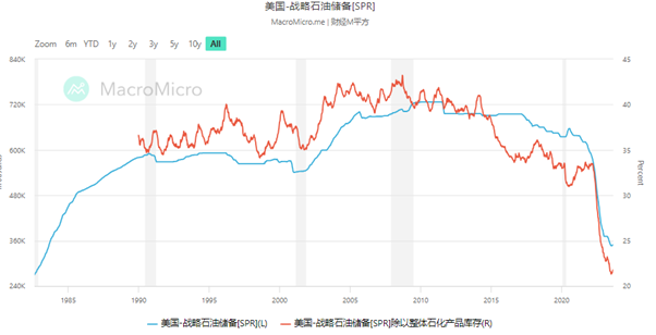 去年被拿来压制油价的美国战略石油,库存已经降至四十年来最低水平。和整体库存的比例更是创下有记录以来的新低。换句话来说就是,国库空虚,入不敷出。在这种情况下,美国很难在扩大释放战略库存,欧洲也同样如此。伴随OPEC减产,全球石油的产能易跌难涨。