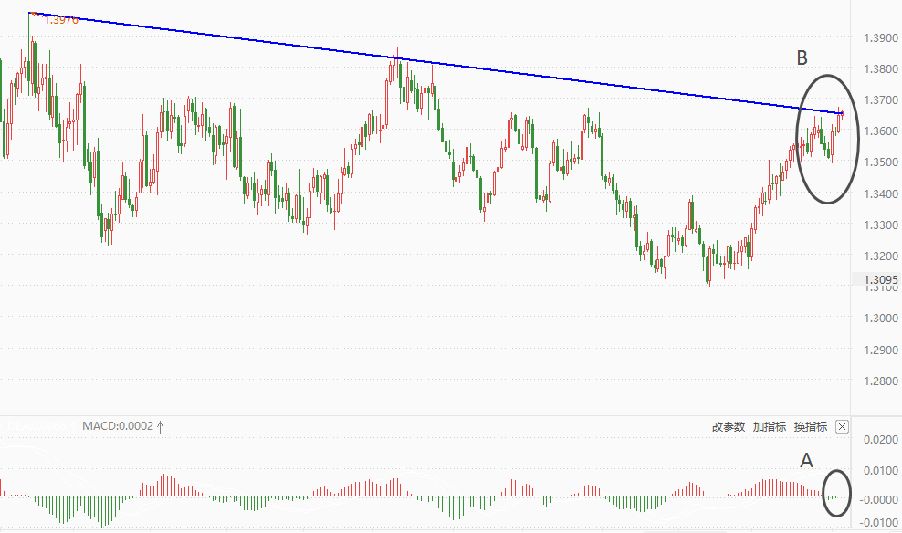 技术角度看,USDCAD日K线运行至2022年10月13日以来的下降趋势线附近,近期面临突破的考验。MACD柱状线在A区域由红转绿,表明趋势线的阻力作用确实存在。今日晚间的利率决议有可能成为重要转折点。由于加息的概率不高,USDCAD有可能在决议后迅速上涨。如果连续三个交易日的K线收盘价位于趋势线上方,则确认有效突破。