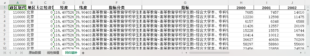 excel数据文件包原始数据(由于多年度指标不同存在缺失值)、线性插值、回归填补三个版本,提供您参考使用。