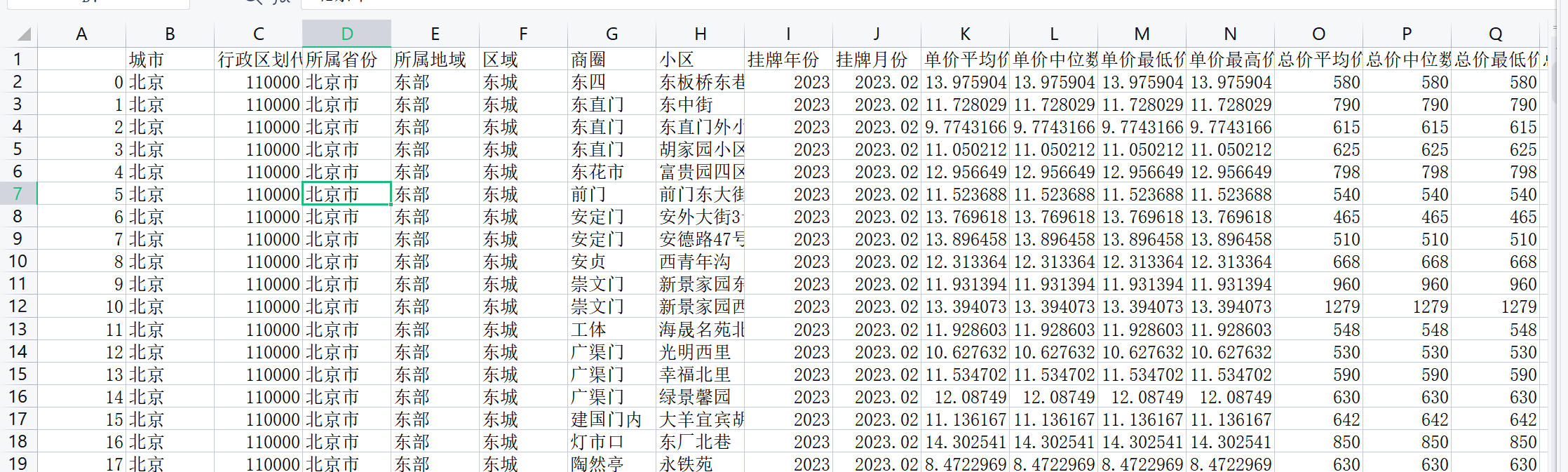 指标包括: 城市 行政区划代码 所属省份 所属地域 区域 商圈 小区 挂牌年份 挂牌月份 单价平均价格 单价中位数价格 单价最低价格 单价最高价格 总价平均价格 总价中位数价格 总价最低价格 总价最高价格