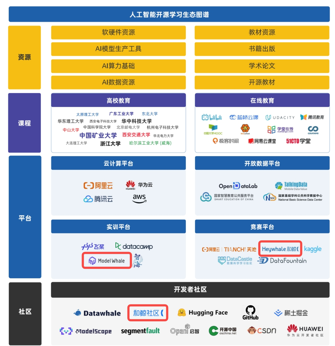 基于对开源人才学习生态的调研,我们根据属性将开源生态的构成元素分为资源型、课程型、平台型及社区型,最终形成《人工智能开源学习生态图谱》。