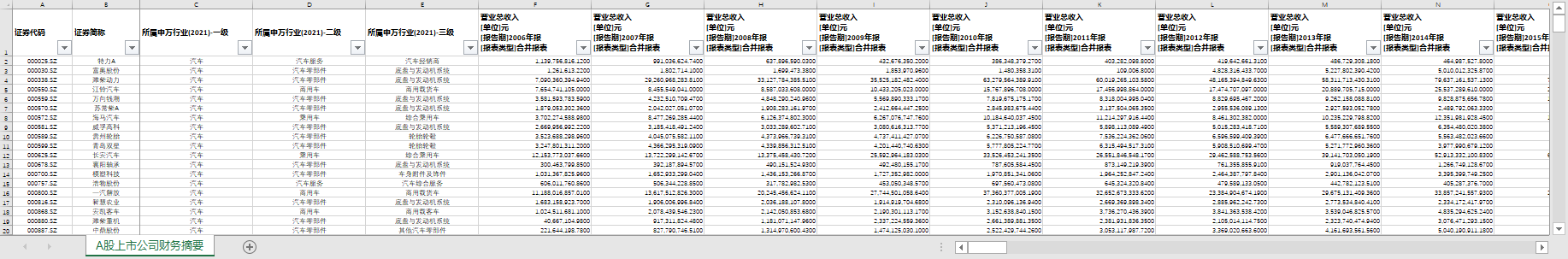 汽车A股上市公司财务摘要2006-2022营业总收入总成本净利润所有者权益资产负债投资筹资经营现金流量
