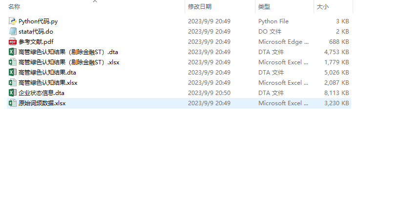 企业状态信息.dta;原始词频数据.xlsx;参考文献.pdf;数据整理代码.do;数据整理结果.dta;高管绿色认知-剔除金融ST的结果.dta;高管绿色认知-原始词频数据处理的Python代码.py