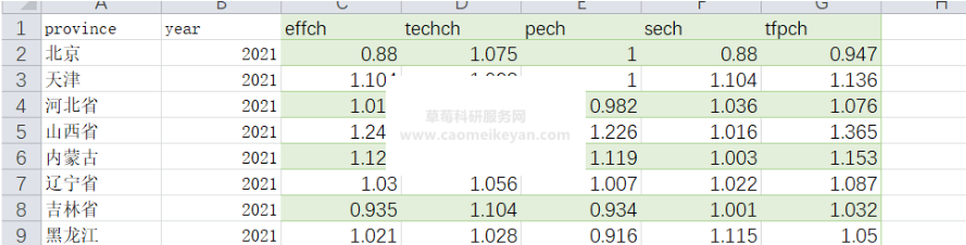 3.数据范围:内容包括:农业全要素生产率、技术效率变化指数、技术进步指数、纯技术效率变化、规模效率变化