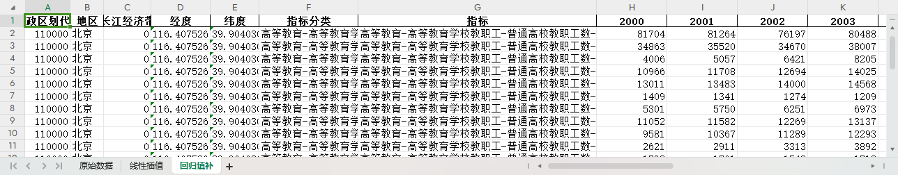 excel数据文件包原始数据(由于多年度指标不同存在缺失值)、线性插值、回归填补三个版本,提供您参考使用。