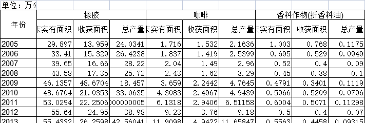2005-2020年云南省橡胶、咖啡和香料作物面积和产量.xlsx