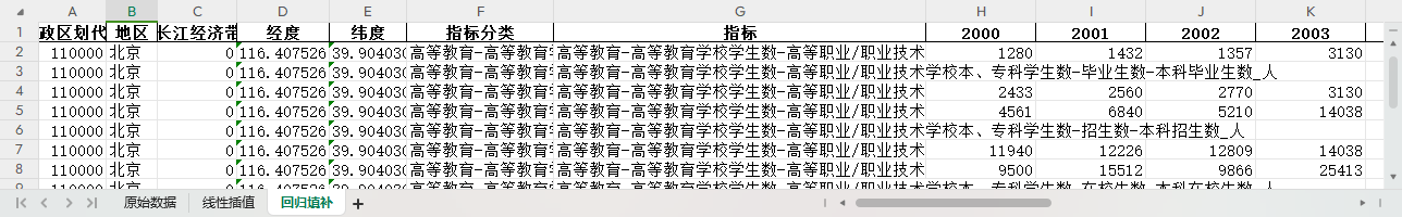 excel数据文件包原始数据(由于多年度指标不同存在缺失值)、线性插值、回归填补三个版本,提供您参考使用。