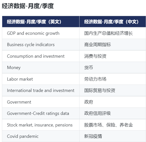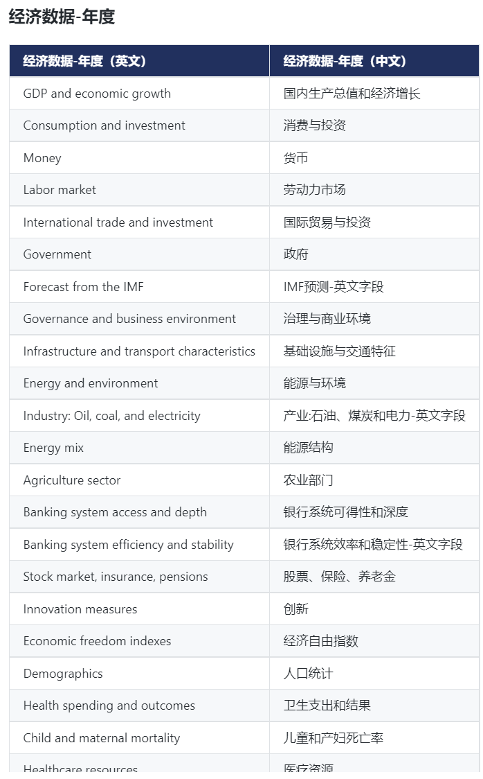 全球宏观经济数据汇总了 200 多个国家/地区的 500 多个统计指标,区分了年度和月度/季度,包含国内生产总值和经济增长、消费与投资、货币、劳动力市场等内容,有助于了解全球不同国家和地区的经济发展的速度与质量。