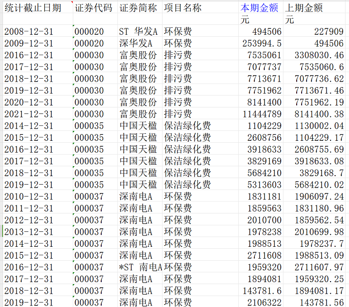 上市公司环境治理费用2008-2021环境治理费用细分指标包括环保费、排污费、清洁绿化费、保险费、安全环保费用等
