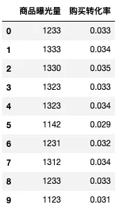 df = pd.Datafr ame({'商品曝光量':[1233,1333,1330,1323,1323,1142,1231,1312,1233,1123],