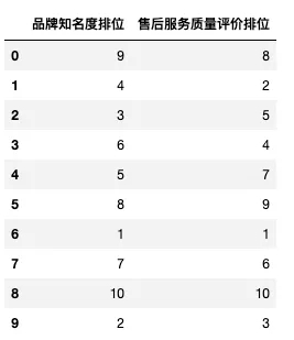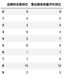 df = pd.Datafr ame({'品牌知名度排位':[9,4,3,6,5,8,1,7,10,2],