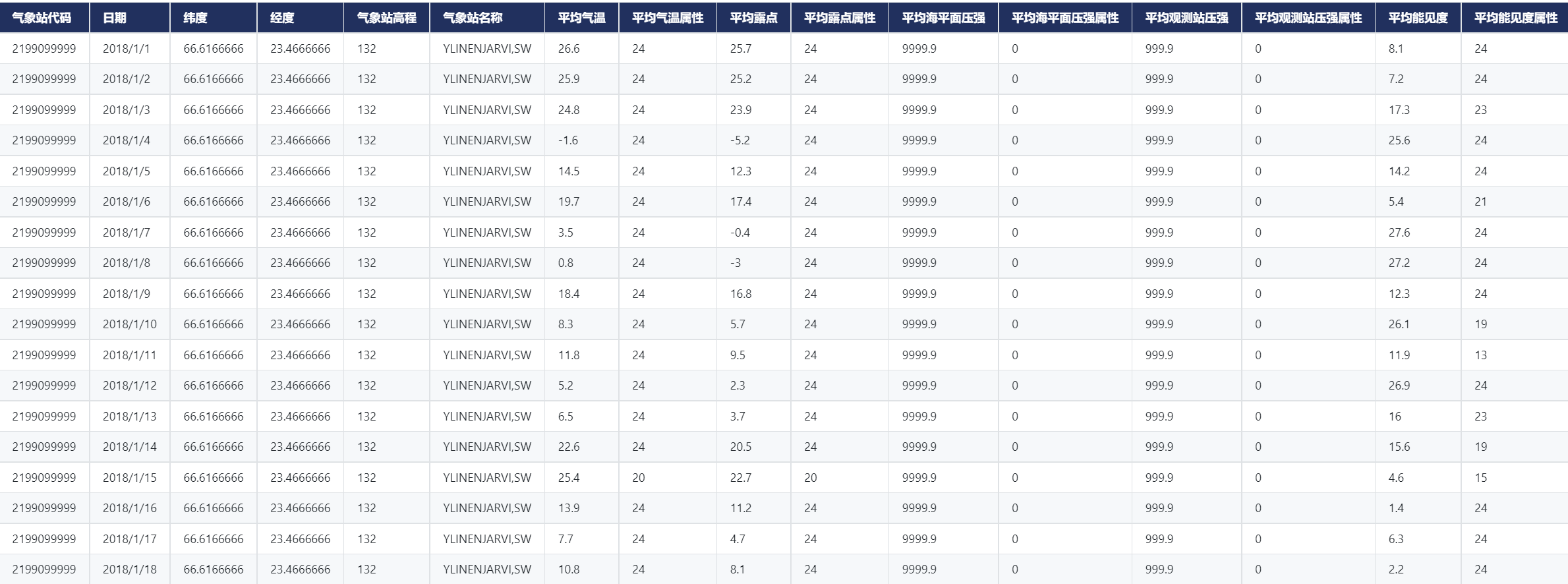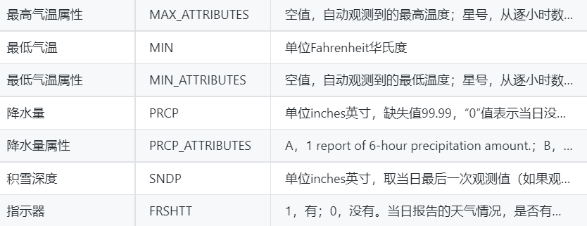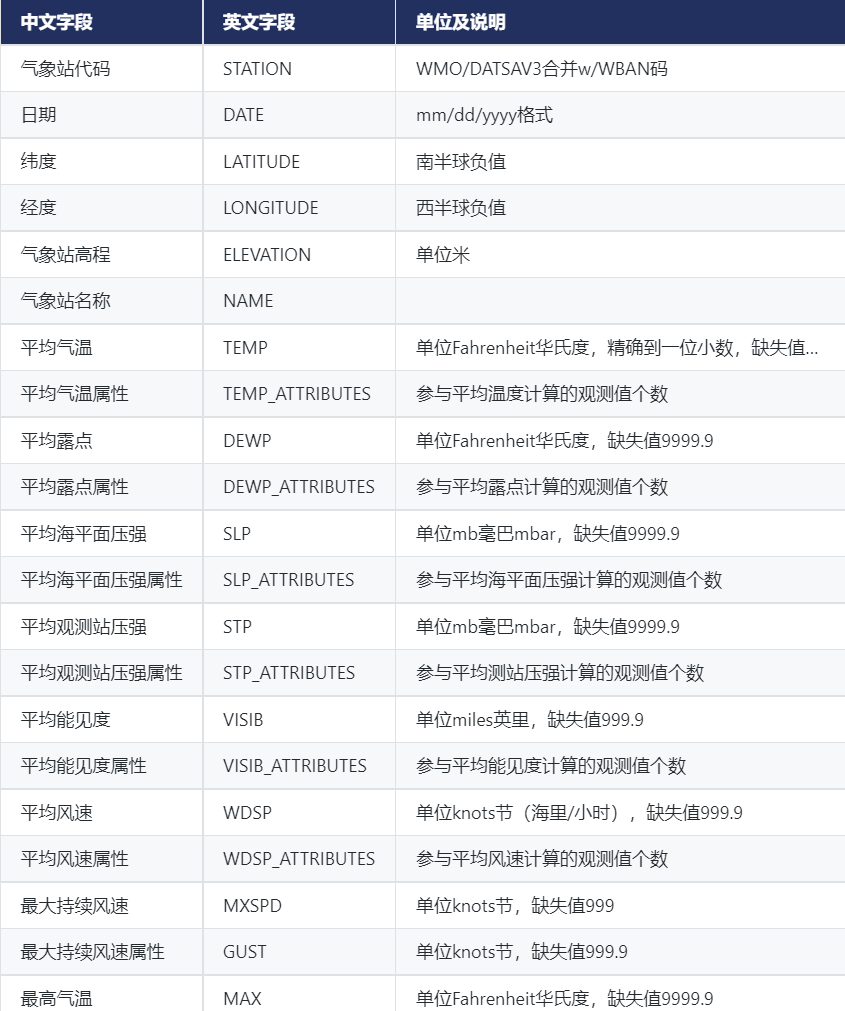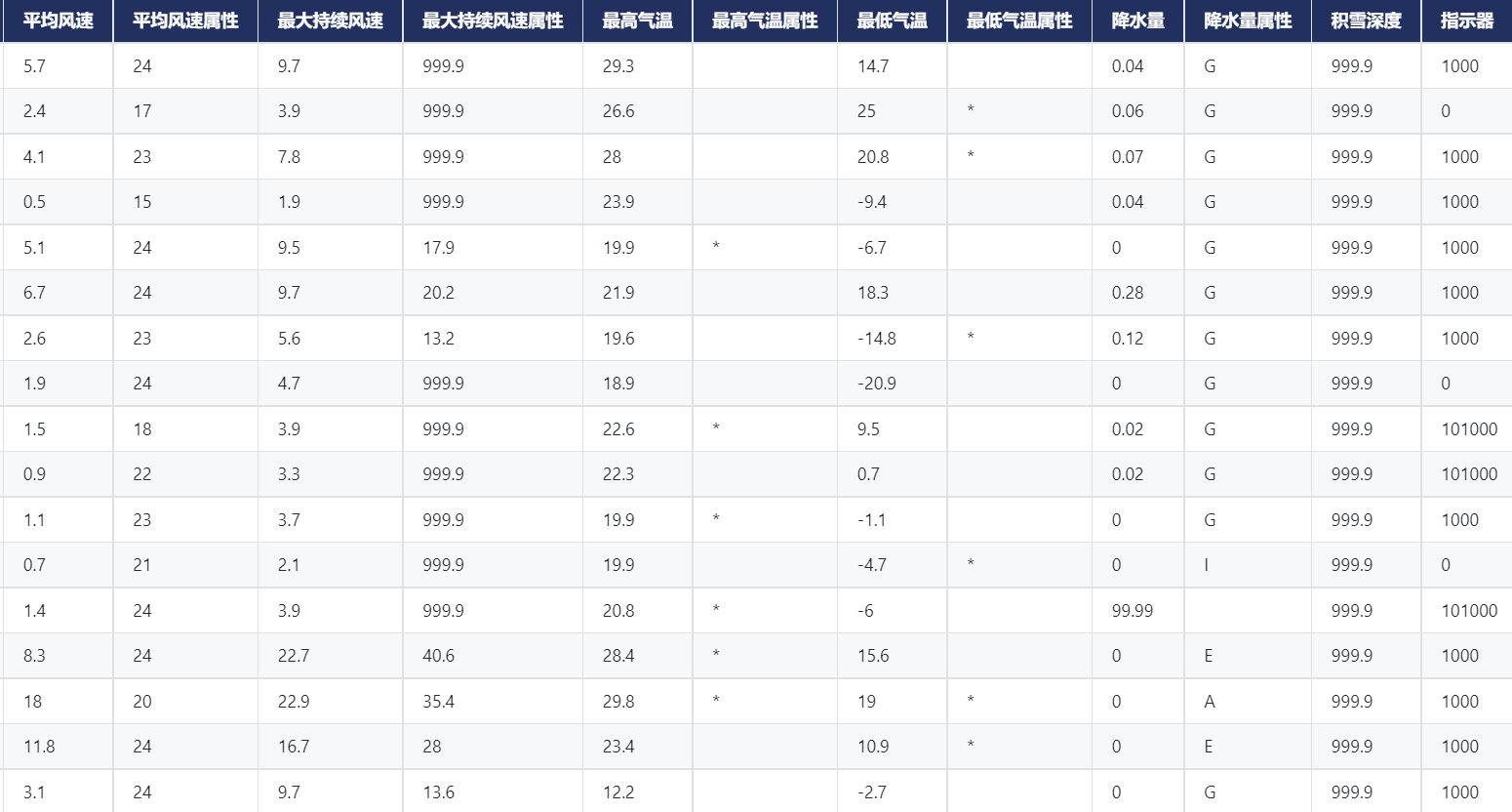 全球逐日气象站点数据是覆盖全球的天气数据的宝贵来源,从1929年至今,并以1973年至今的数据最为完整,最新每日数据摘要观测日期时间之后的1-2天发布。每日数据类型除降水量(0.01英寸),还包括:平均温度(0.1华氏度)、最高温度(0.1华氏度)、最低温度(0.1华氏度)、平均风速(0.1节)、最大持续风速(0.1节)、最大阵风(0.1节)和积雪深度(0.1英寸)等。