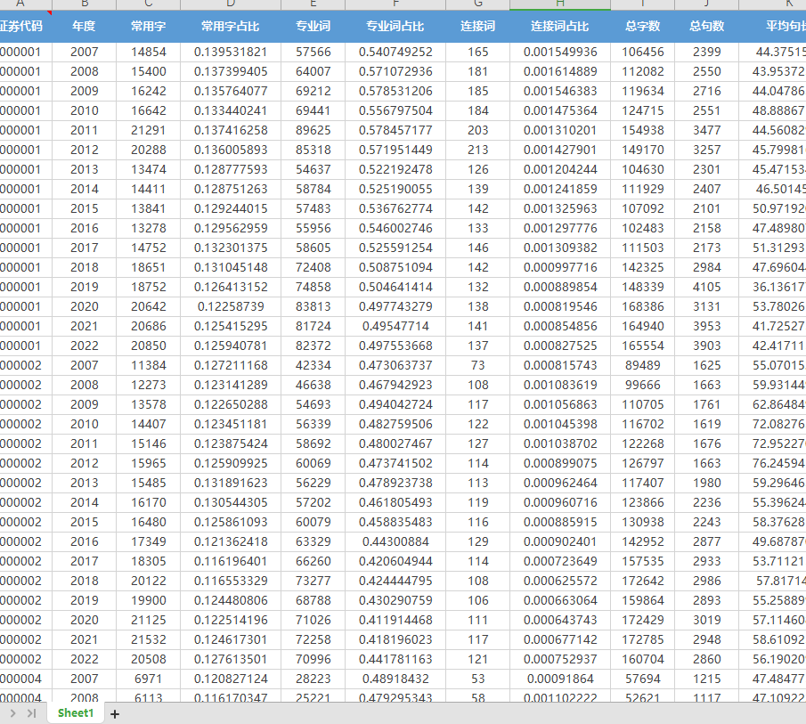 证券代码、年度、常用字、常用字占比、专业词、专业词占比、连接词、连接词占比、总字数、总句数、平均句长、常用字占比、专业词占比 连接词占比、平均句长、可读性