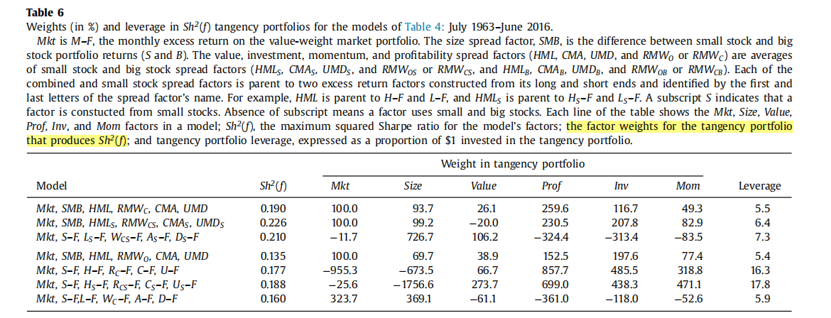 各位师兄师姐们,请问《Fama, E. F. and K. R. French, 2018. “Choosing factors.” Journal of Financial Economics, 128(2), 234 – 252.》的table 6中的weight in tangency portfolio是怎么计算得出的?导师让我下周做汇报,但这一部分实在看不太懂了,大家能否帮帮我