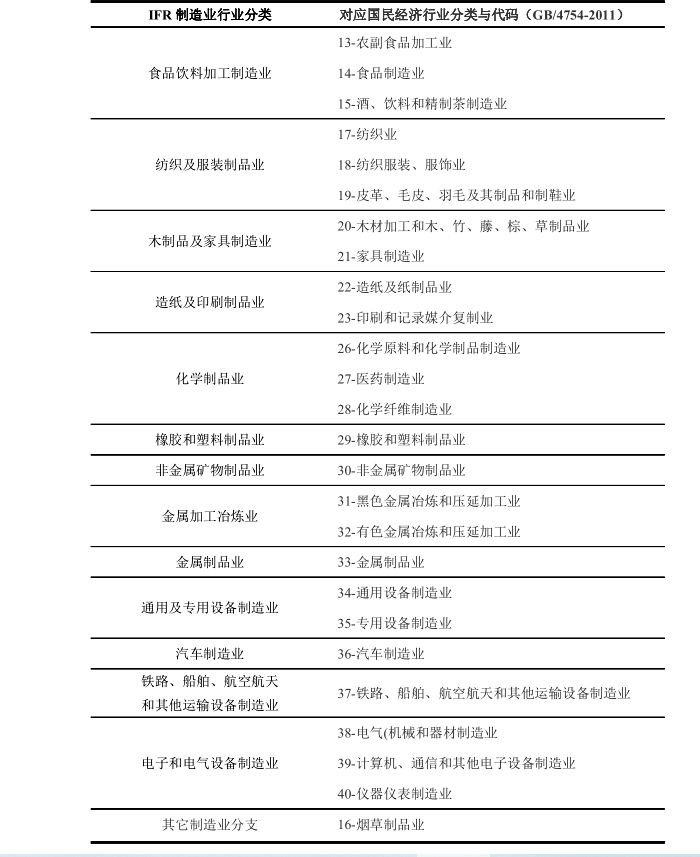 根据国际机器人联合会(International Federation of Robotics, IFR)的统计口径,主要涉及的14个制造业细分行业的英文名称如下: