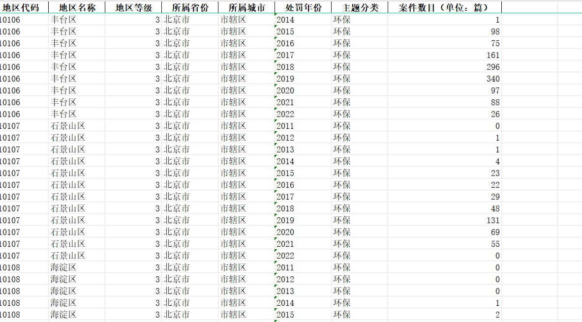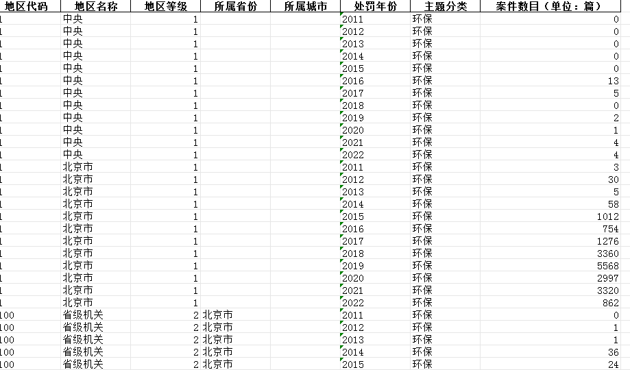 4、指标:地区代码、地区名称、地区等级、所属省份、所属城市、处罚年份、主题分类、案件数目