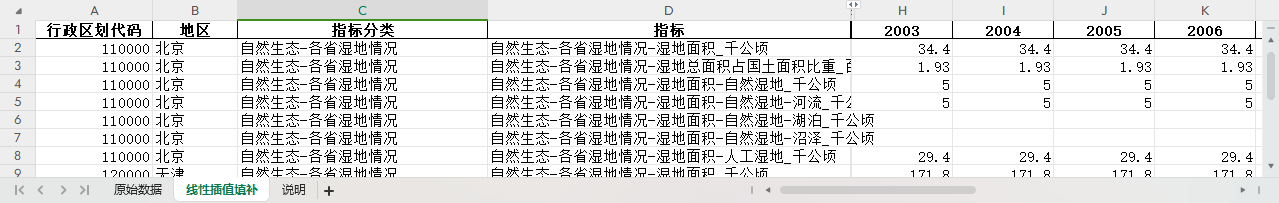 excel数据文件包原始数据(由于多年度指标不同存在缺失值)、线性插值两个版本,提供您参考使用。