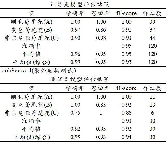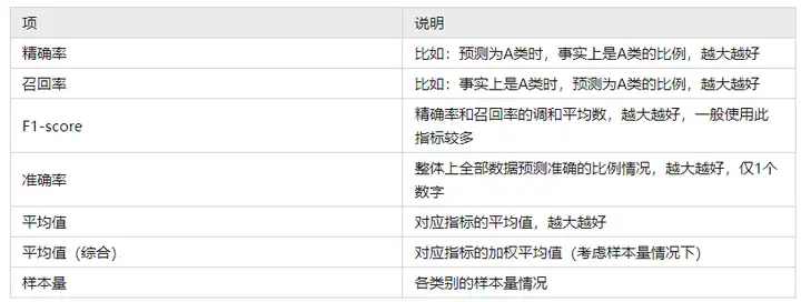 上表格中分别针对训练集和测试集,提供四个评估指标,分别是精确率、召回率、f1-scrore、准确率,以及平均指标和样本量指标等,如下表格说明: