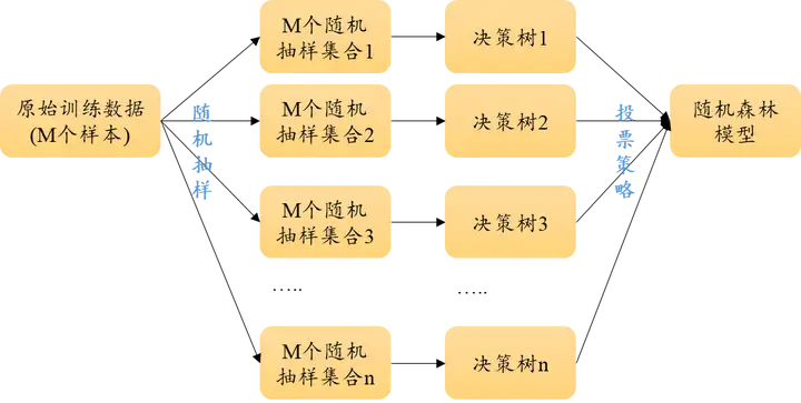 上述中提及随机森林模型是多个决策树模型的综合,但是数据本身就只有一份,其是如何做到多个决策树模型呢?此处涉及到随机抽样原理,比如有100个数据,第1次随机从其中随机抽取100个数据,就得到一份新数据,即可使用该新数据进行一次决策树模型构建,接着第2次重复随机抽取100个数据,又得到一份新数据,再次使用新数据进行一次决策树模型构建。不停地重复循环上述步骤,即得到多个决策树模型;至于应该是多少个决策树,这可由参数设置决定。在得到多个决策树后,利用投票方式(比如多份数据均指向应该为A类别,那么就为A类别)或者求解均值概率方式来统计最终的分类结果。