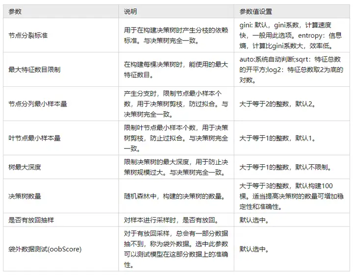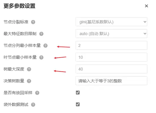 随机森林时,通常可以对“节点分列最小样本量”、“叶节点最小样本量”、“树最大深度”进行参数设置,该3个参数值与决策树模型完全一致,可参考决策树模型手册(点击后跳到决策树模型的帮助手册页面)。