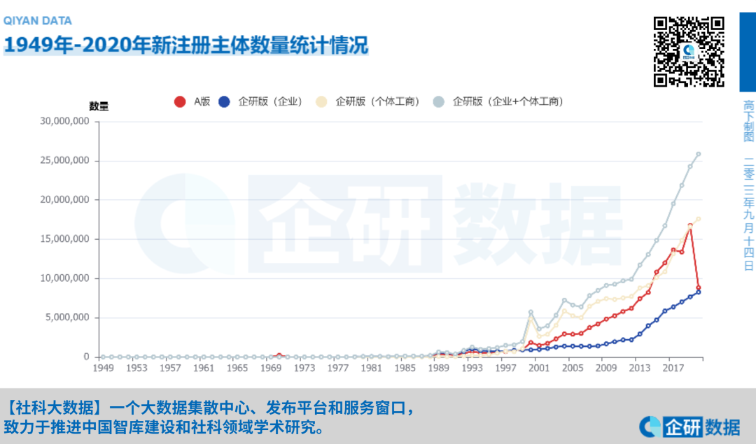为了确保对比口径的一致,我们基于企研版数据集分别统计了“企业”、“个体工商户”、“企业+个体工商户”三个口径的数据量,并与A版数据集进行对比。表1是两个数据集1949-2020年新注册主体数量的统计情况。