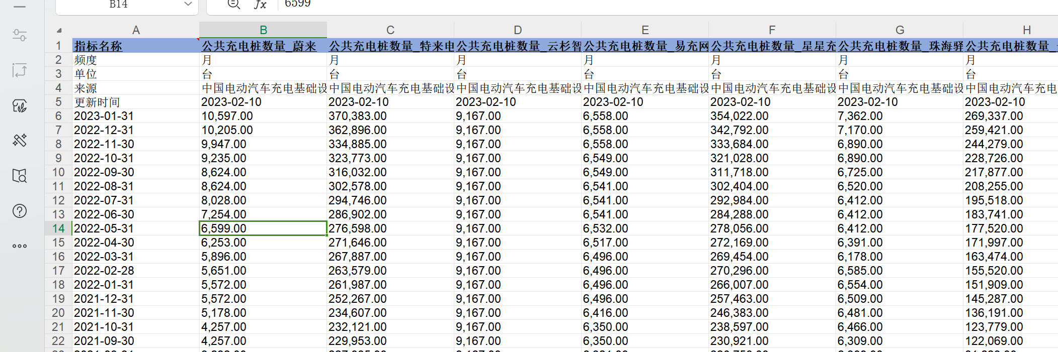指标包括:指标名称 公共充电桩数量_蔚来 公共充电桩数量_特来电 公共充电桩数量_云杉智慧 公共充电桩数量_易充网 公共充电桩数量_星星充电 公共充电桩数量_珠海驿联 公共充电桩数量_云快充 公共充电桩数量_简单充 公共充电桩数量_中国普天 公共充电桩数量_亨通鼎充 公共充电桩数量_开迈斯 公共充电桩数量_森通智达 公共充电桩数量_南京能瑞 公共充电桩数量_万城万充 公共充电桩数量_电王快充 公共充电桩数量_万马爱充 公共充电桩数量_南方电网 公共充电桩数量_国家电网 公共充电桩数量_上汽安悦 公共充电桩数量_联合快充 公共充电桩数量_思极星能 公共充电桩数量_特斯拉 公共充电桩数量_汇充电 公共充电桩数量_依威能源 公共充电桩数量_深圳巴士 公共充电桩数量_直流_联合快充 [停]公共充电桩数量_交流_森通智达 公共充电桩数量_公用_桩到家 公共充电桩数量_专用_珠海驿联 公共充电桩数量_公用_深圳聚电 公共充电桩数量_公用_万马爱充 公共充电桩数量_公用_易充网 公共充电桩数量_公用_简单充 公共充电桩数量_专用_南京能瑞 公共充电桩数量_直流_特来电 公共充电桩数量_直流_上汽安悦 公共充电桩数量_直流_开迈斯 公共充电桩数量_交流_云快充 公共充电桩数量_交流_劲桩 公共充电桩数量_交流_南方电网 公共充电桩数量_交流_万城万充 公共充电桩数量_专用_特来电 公共充电桩数量_专用_深圳车电网 公共充电桩数量_交流_深圳聚电 公共充电桩数量_公用_云杉智慧 公共充电桩数量_公用_特来电 公共充电桩数量_公用_国家电网 公共充电桩数量_直流_国家电网 公共充电桩数量_桩到家 公共充电桩数量_交流_上汽安悦 公共充电桩数量_直流_江苏绿城 公共充电桩数量_交流_星星充电 公共充电桩数量_交流_南京能瑞 公共充电桩数量_直流_易充网 公共充电桩数量_交流_蔚来 公共充电桩数量_专用_云快充 公共充电桩数量_公用_亨通鼎充 公共充电桩数量_公用_思极星能 公共充电桩数量_深圳车电网 公共充电桩数量_公用_依威能源 公共充电桩数量_公用_开迈斯 公共充电桩数量_专用_特斯拉 公共充电桩数量_直流_万马爱充 公共充电桩数量_公用_云快充 公共充电桩数量_直流_云杉智慧 公共充电桩数量_交流_万马爱充 公共充电桩数量_交流_国家电网 公共充电桩数量_交流_云杉智慧 公共充电桩数量_交流_富电 公共充电桩数量_交流_易充网 公共充电桩数量_交流_依威能源 公共充电桩数量_公用_联合快充 公共充电桩数量_直流_亨通鼎充 公共充电桩数量_专用_云杉智慧 公共充电桩数量_专用_联合快充 公共充电桩数量_专用_桩到家 公共充电桩数量_公用_珠海驿联 公共充电桩数量_公用_电王快充 公共充电桩数量_直流_星星充电 公共充电桩数量_公用_万城万充 公共充电桩数量_公用_蔚来 公共充电桩数量_公用_中国普天 公共充电桩数量_公用_森通智达 公共充电桩数量_专用_深圳巴士 公共充电桩数量_交流_特来电 公共充电桩数量_直流_深圳巴士 公共充电桩数量_交流_汇充电 公共充电桩数量_交流_亨通鼎充 公共充电桩数量_交流_简单充 公共充电桩数量_交流_深圳车电网 公共充电桩数量_交流_珠海驿联 公共充电桩数量_交流_中国普天 公共充电桩数量_直流_蔚来 公共充电桩数量_交流_联合快充 公共充电桩数量_公用_上汽安悦 公共充电桩数量_专用_中国普天 公共充电桩数量_直流_深圳车电网 公共充电桩数量_公用_江苏绿城 公共充电桩数量_公用_劲桩 公共充电桩数量_直流_云快充 公共充电桩数量_公用_星星充电 公共充电桩数量_直流_南方电网 公共充电桩数量_公用_深圳车电网 公共充电桩数量_公用_南方电网 公共充电桩数量_公用_富电 公共充电桩数量_公用_汇充电 公共充电桩数量_公用_南京能瑞 公共充电桩数量_交流_桩到家 公共充电桩数量_直流_南京能瑞 公共充电桩数量_直流_万城万充 公共充电桩数量_直流_珠海驿联 公共充电桩数量_交流_开迈斯 公共充电桩数量_直流_思极星能 公共充电桩数量_直流_电王快充 公共充电桩数量_直流_特斯拉 公共充电桩数量_直流_劲桩 公共充电桩数量_交流_电王快充 公共充电桩数量_直流_中国普天 公共充电桩数量_专用_星星充电 公共充电桩数量_专用_上汽安悦 公共充电桩数量_专用_亨通鼎充 公共充电桩数量_专用_国家电网