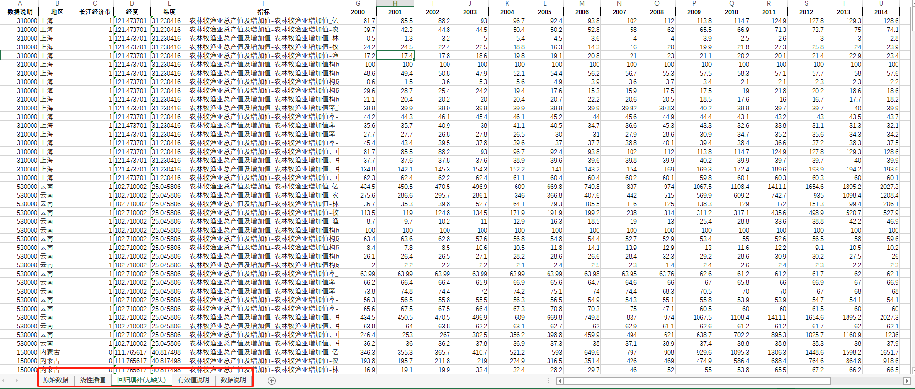 中国农村统计年鉴数据库(包含四个页签:原始数据、线性插值、ARIMA填补、有效统计值四个页签)利用线性趋势对中间缺失进行填充,得到线性插值版,利用时间趋势,对剩余缺失进行预测,得到ARIMA填补版,最终,保留原始版本、线性插值版、ARIMA填补版。