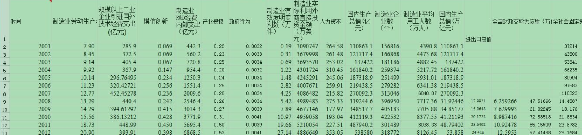 2.数据范围:时间、制造业劳动生产率(亿元/万人)、规模以上工业企业引进国外技术经费支出(亿元)、模仿创新、制造业R&D经费内部支出(亿元)、 产业规模、政府行为、制造业有效发明专利数(万件) 制造业实际利用外商直接投资金额(万美元)、人力资本、国内生产总值(亿元) 、制造业企业数(个)、制造业平均用工人数(万人)、国内生产总值(万亿元)、 进出口总值(万亿)、全国财政支出(万亿元)、M2供应量(万亿元)、全社会固定资产投资(万亿元)