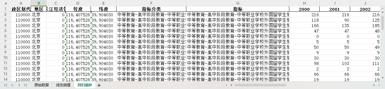 excel数据文件包原始数据(由于多年度指标不同存在缺失值)、线性插值、回归填补三个版本,提供您参考使用。