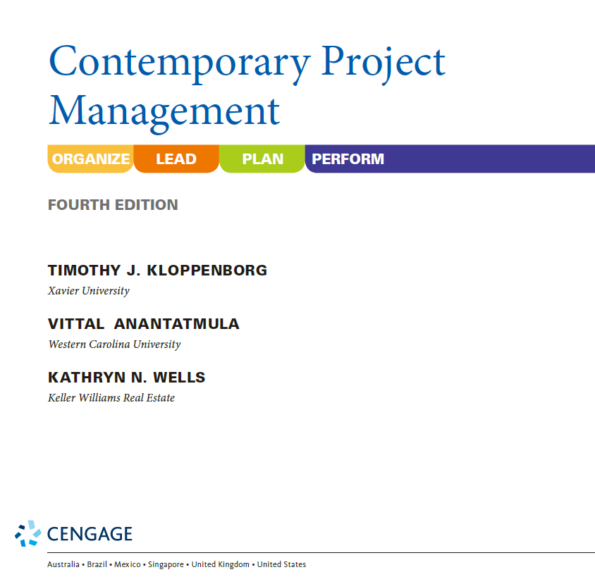 Timothy J. Kloppenborg, Contemporary Project Management, 4thedition, 2019 published by Cengage, total page: 581