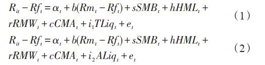 模型(1)和(2)中的R表示资产在t时期的收益率,Rf表示无风险利率,Rm- Rf表示市场风险溢价因子(即市场超额收益率,是考虑现金红利再投资的月市场收益率与月度化无风险利率之差所得),系数为b; SMB,表示规模因子,系数为s;HML表示账面市值比因子,系数为h;RMW表示盈利因子,系数为r;CMA表示投资因子,系数为c;模型(1)中的Tliq表示通过换手率测度的流动性因子,其系数记为i1;模型(2)中的ALiq表示通过Amihud指标衡量的流动性因子,其系数记为i2;α和e分别表示截距与残差项。
