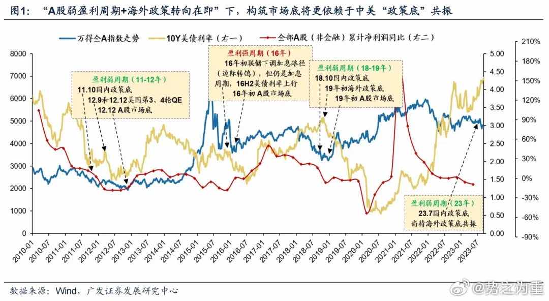 广发证券研报的共振理论:大A的走势和美债利率的共振【看蓝线和黄线】。根据这个图谱,这是得等着美债利率下来,大A就窜上去?大A跟美债比比剪刀?