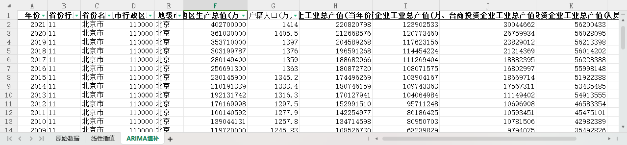 excel数据文件包原始数据(由于多年度指标不同存在缺失值)、线性插值、ARIMA填补三个版本,提供您参考使用。