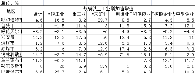 该数据包含了2020年内蒙古各盟市规模以上工业增加值增速。呼和浩特市规模以上工业增加值增速合计为4.6%。