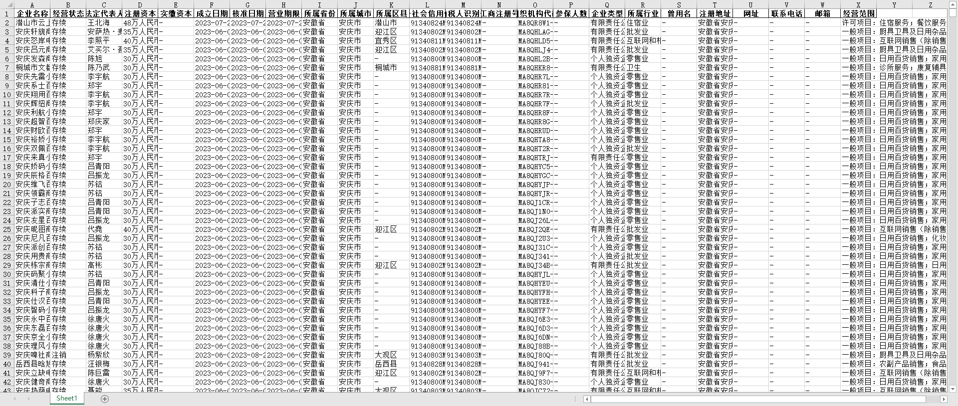 企业名称 经营状态 法定代表人 注册资本 实缴资本 成立日期 核准日期 营业期限 所属省份 所属城市 所属区县 统一社会信用代码 纳税人识别号 工商注册号 组织机构代码 参保人数 企业类型 所属行业 曾用名 注册地址 网址 联系电话 邮箱 经营范围