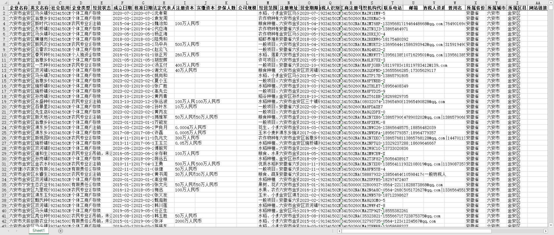 企业名称 经营状态 法定代表人 注册资本 实缴资本 成立日期 核准日期 营业期限 所属省份 所属城市 所属区县 统一社会信用代码 纳税人识别号 工商注册号 组织机构代码 参保人数 企业类型 所属行业 曾用名 注册地址 网址 联系电话 邮箱 经营范围