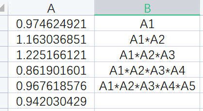请问excel怎么处理可以简单快捷计算得出B列这样的列式,下面还需要算很多这样的连乘,product函数只能一格一格的算,有没有那种可以快速求出一列这样连乘的函数,求助!!!